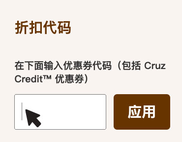 寻找优惠券代码框上的购物车页面输入您的 Cruz Credit™ 优惠券代码并点击申请退房前。